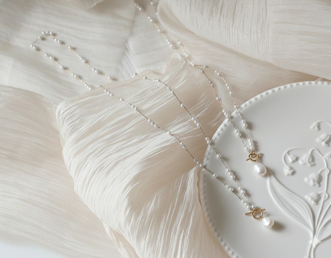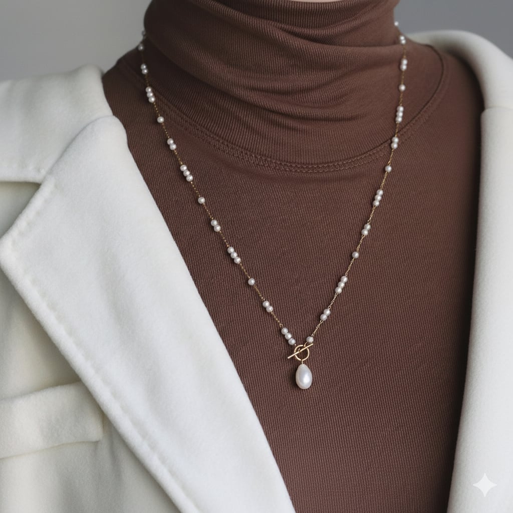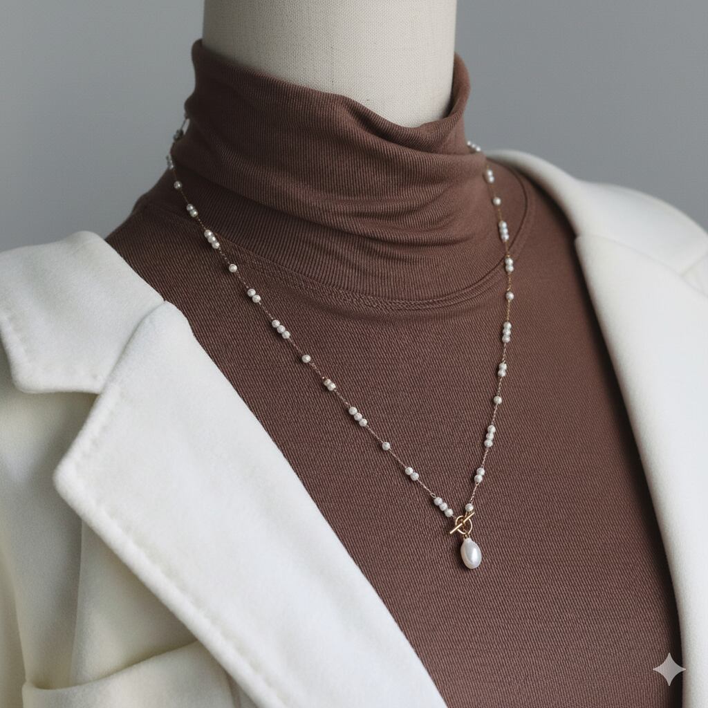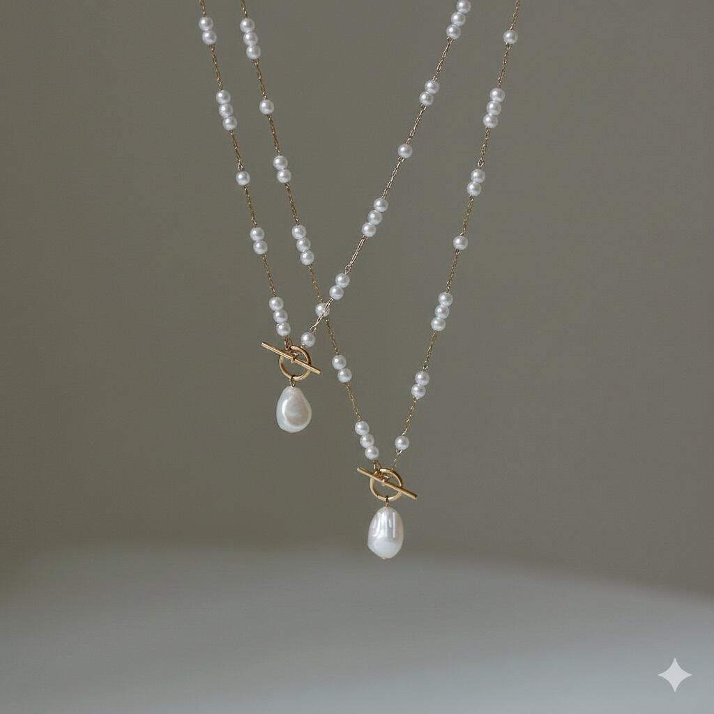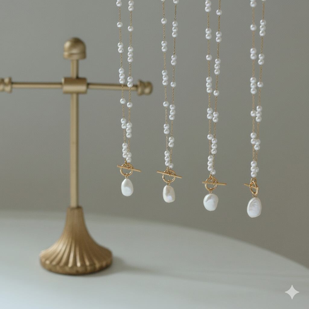 素材:ステンレス、プラスチックパール(チェーン)、淡水パール(トップ)