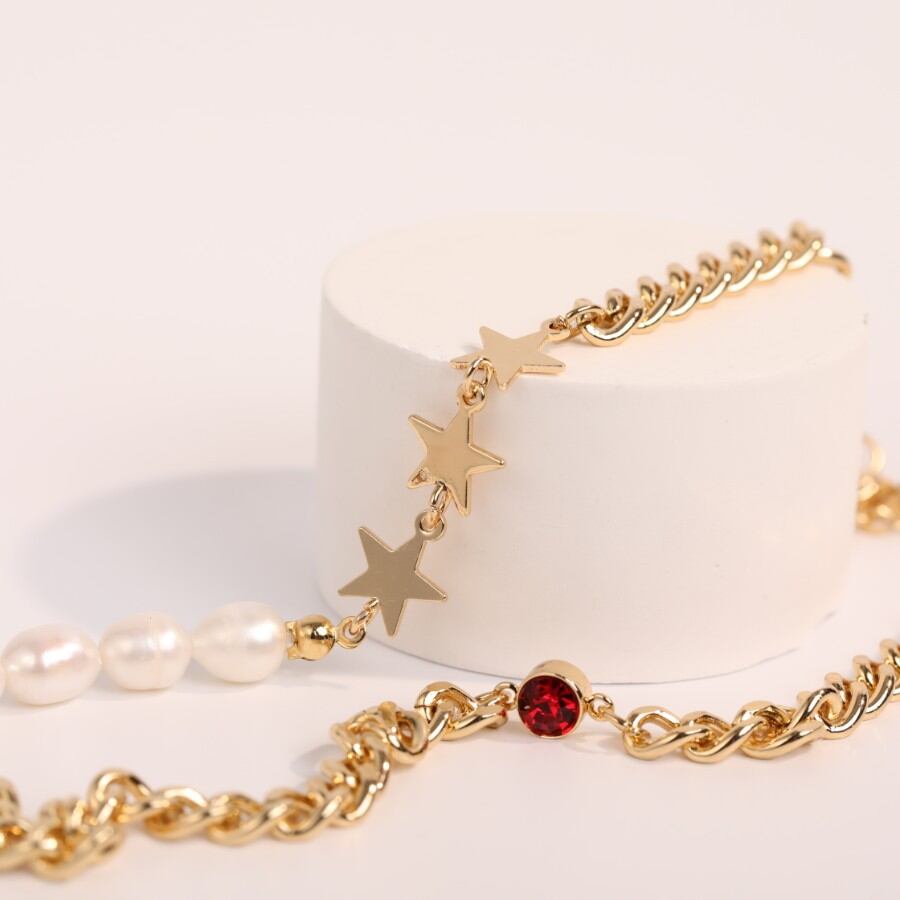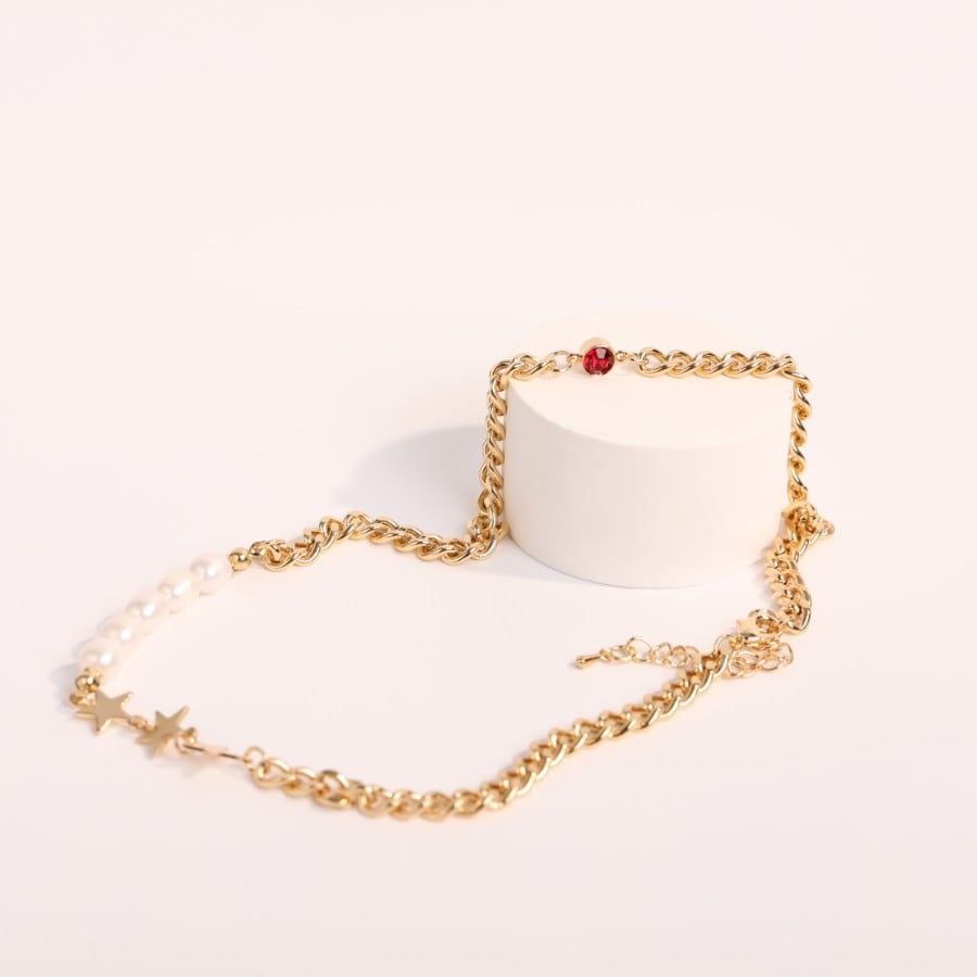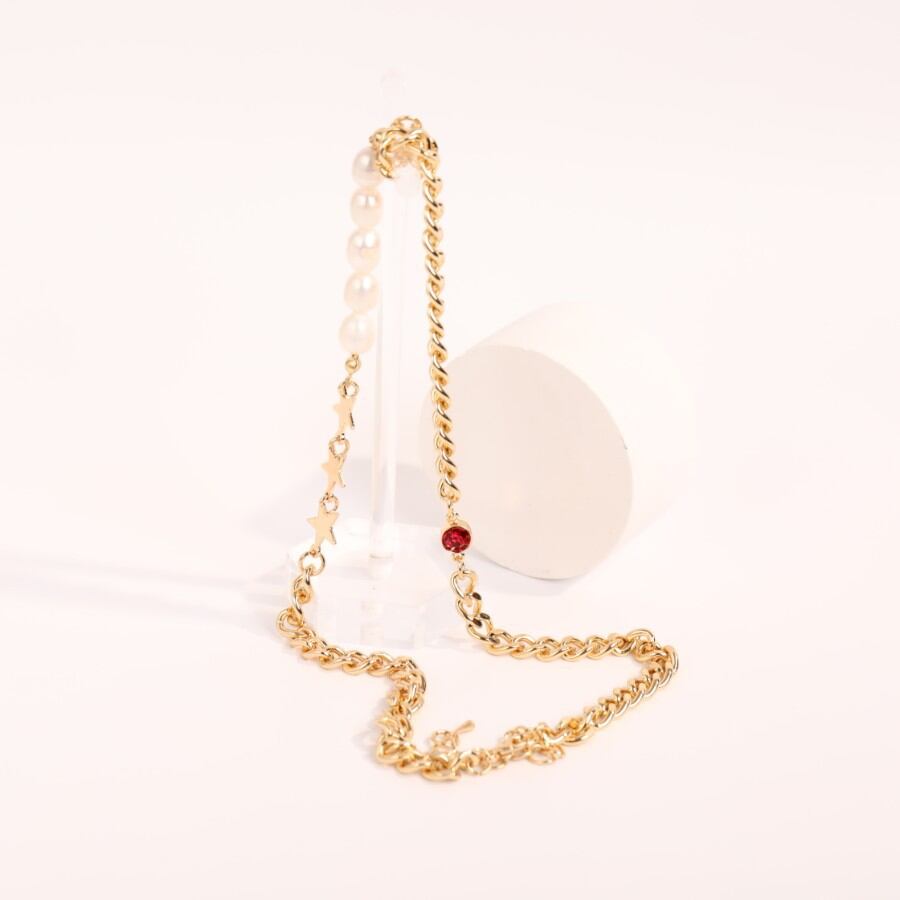 赤いジルコニアとスターモチーフがクリスマスシーズンを連想させるデザインネックレス。