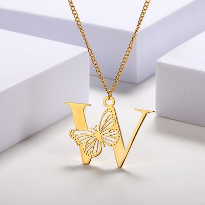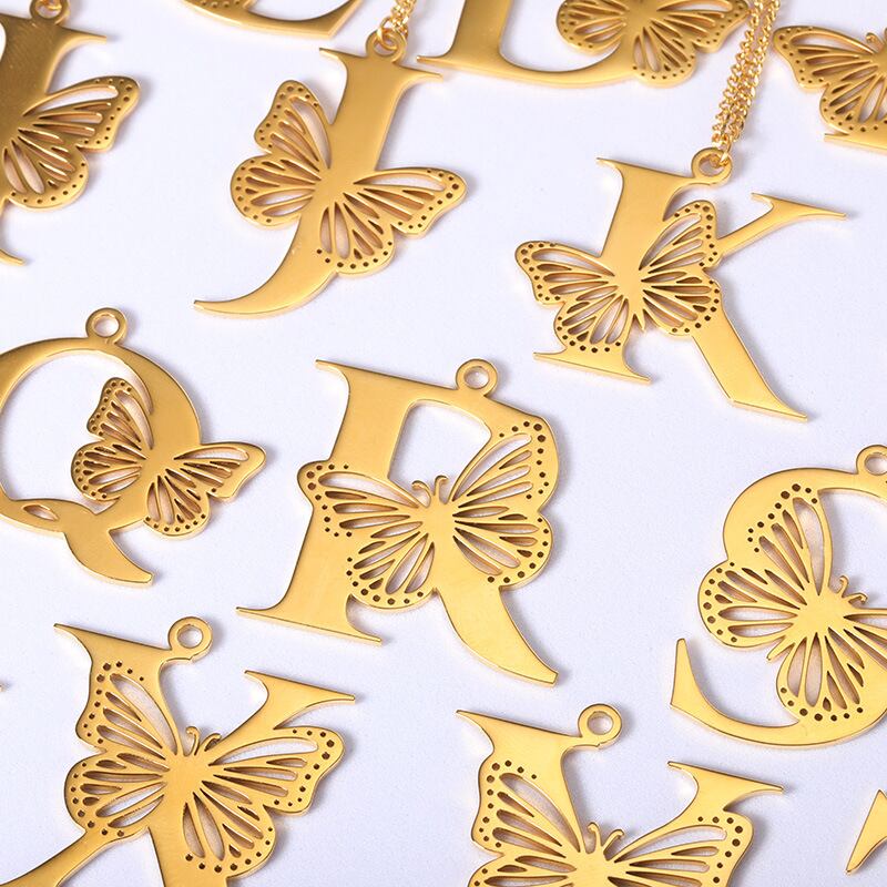 蝶々とアルファベットをデザインしたイニシャルチャームのネックレス。