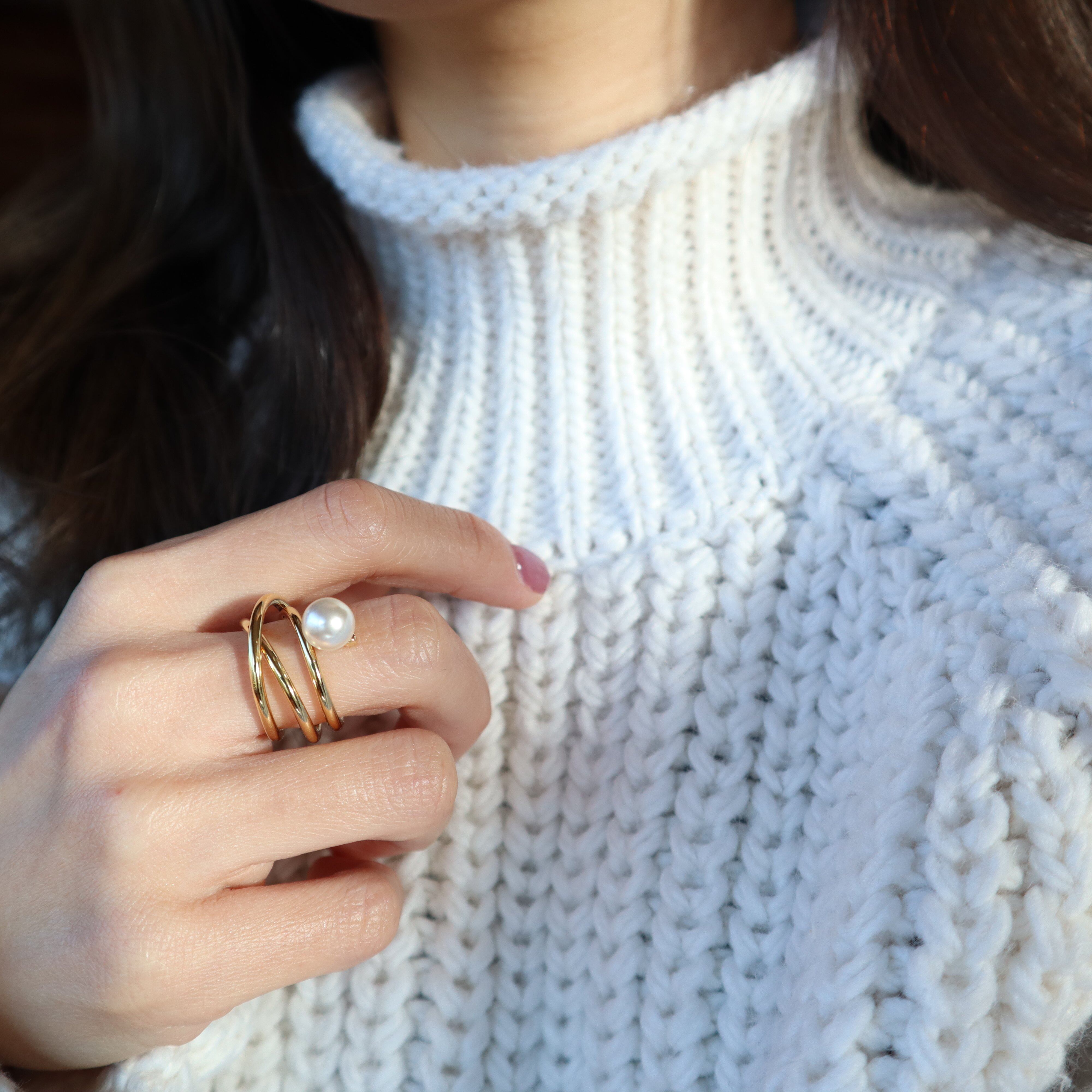 指にくるくる巻き付いた地金にパールが付いたデザインリング。