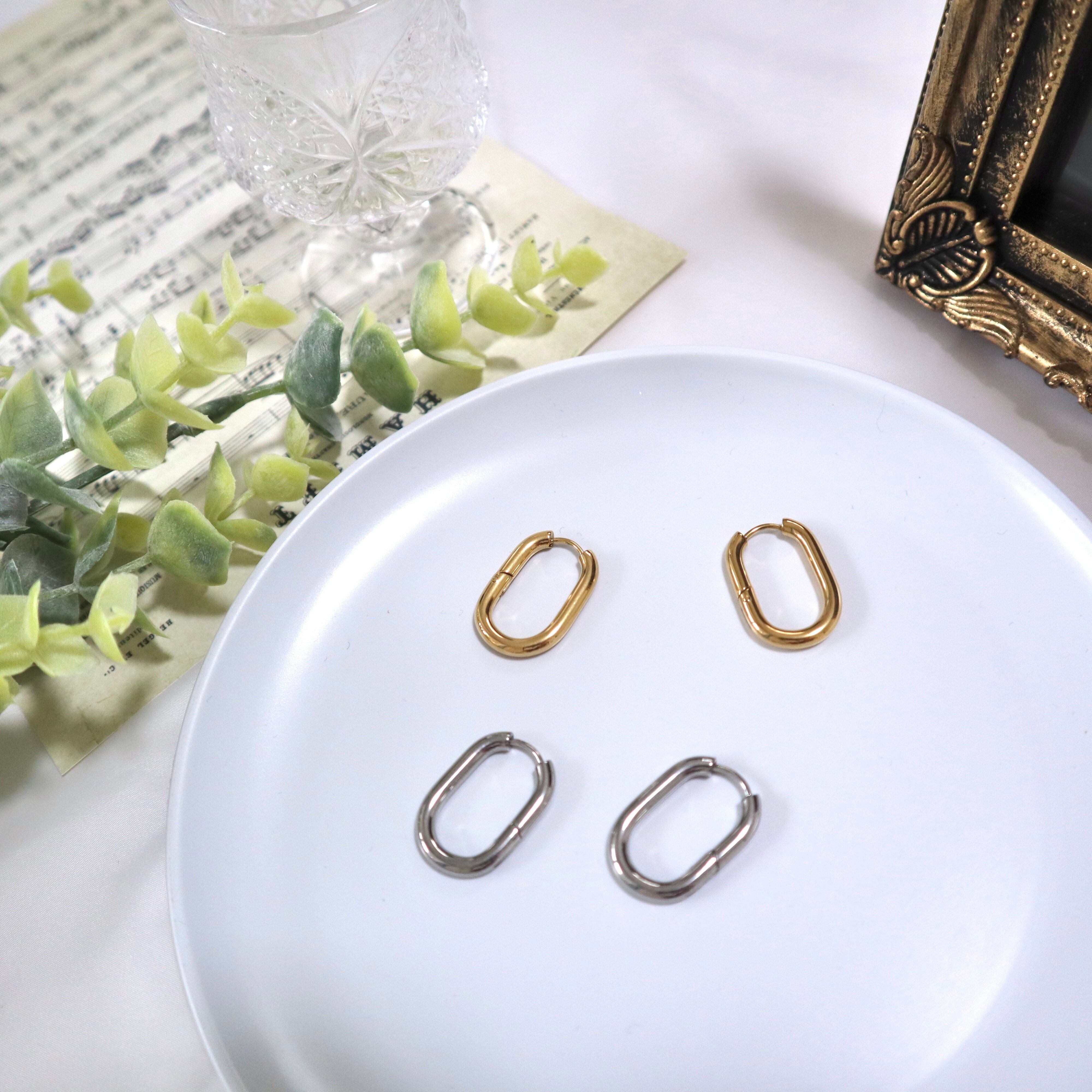 オーバル型のワンタッチピアス。なめらかな曲線形状なので、洋服に引っかかったりすることもありません。