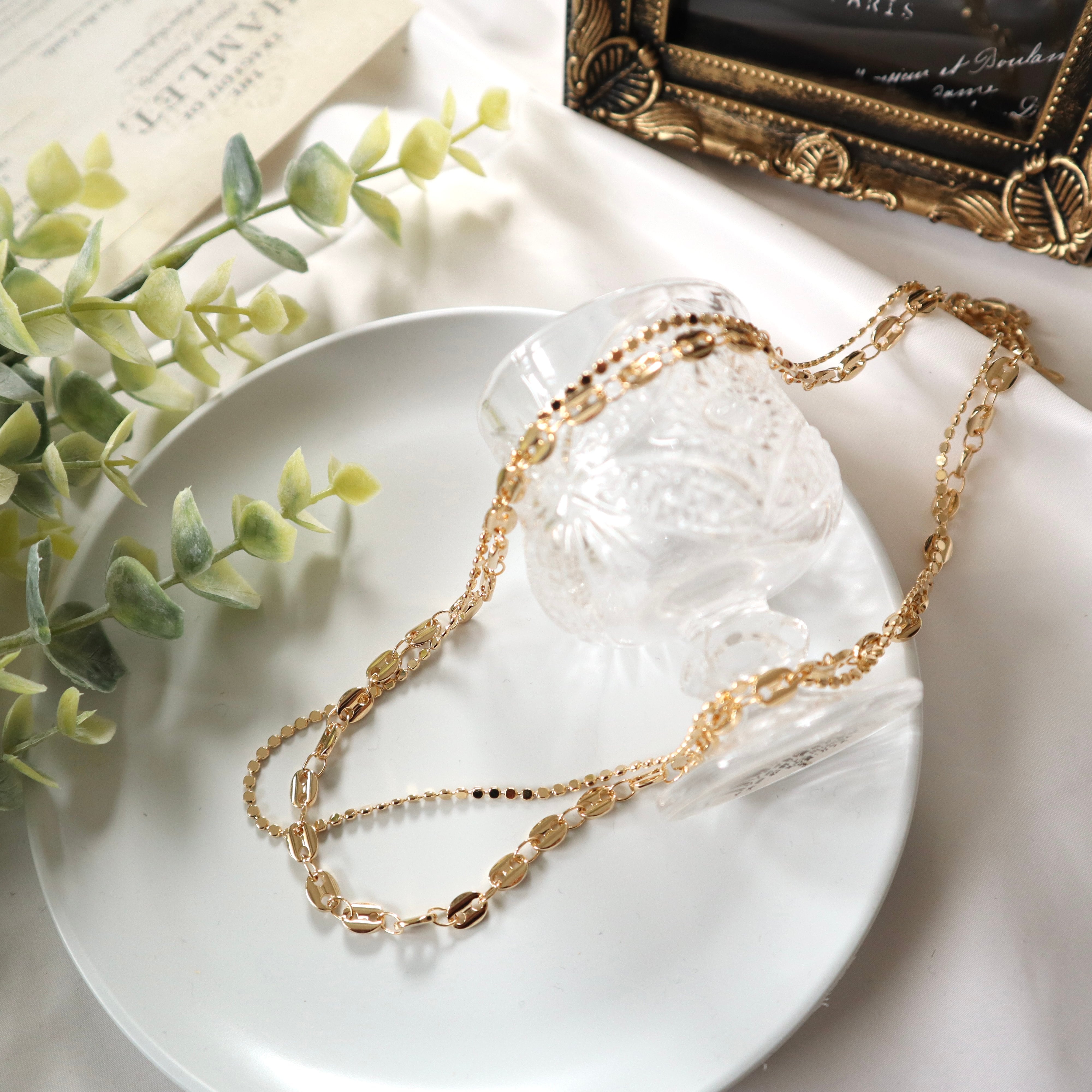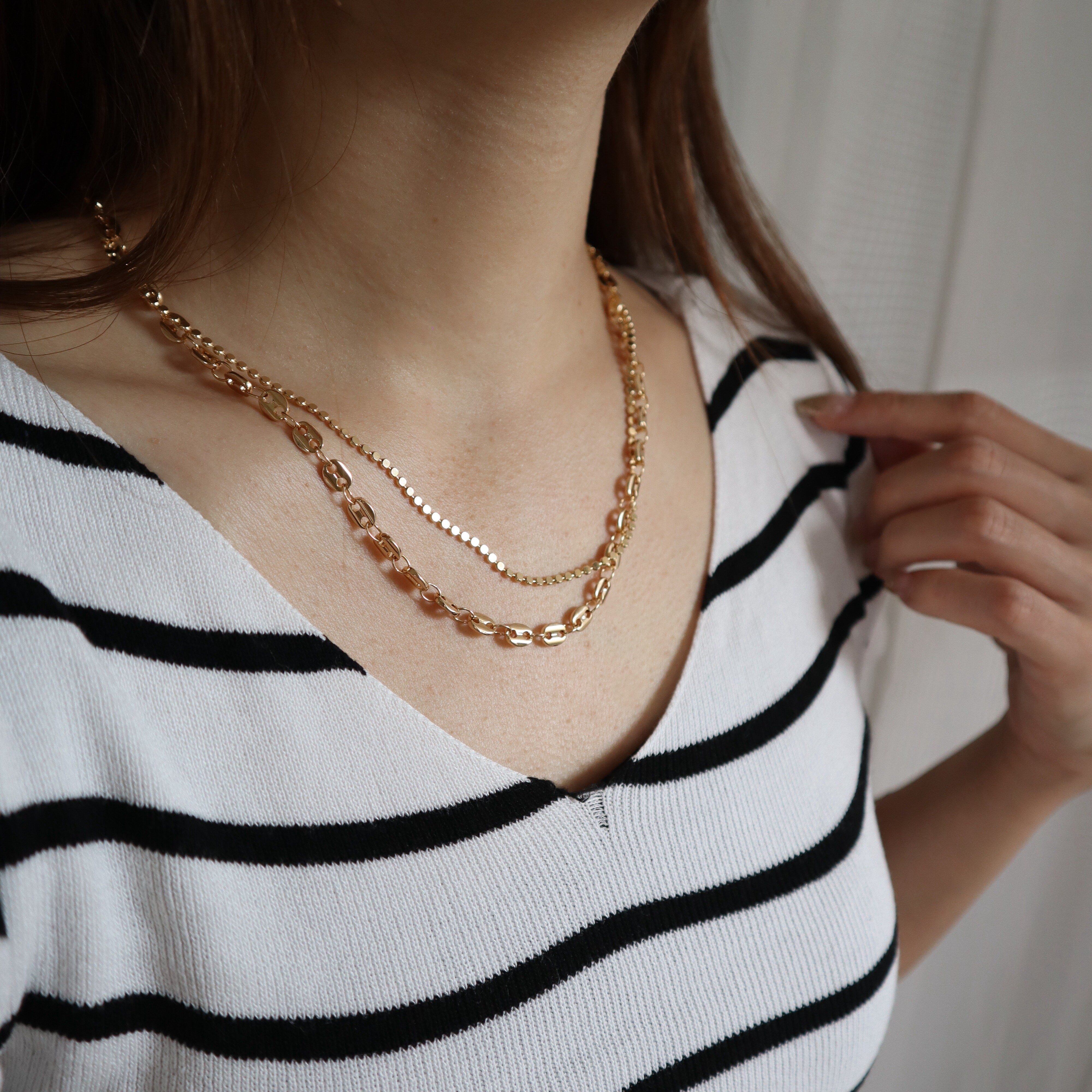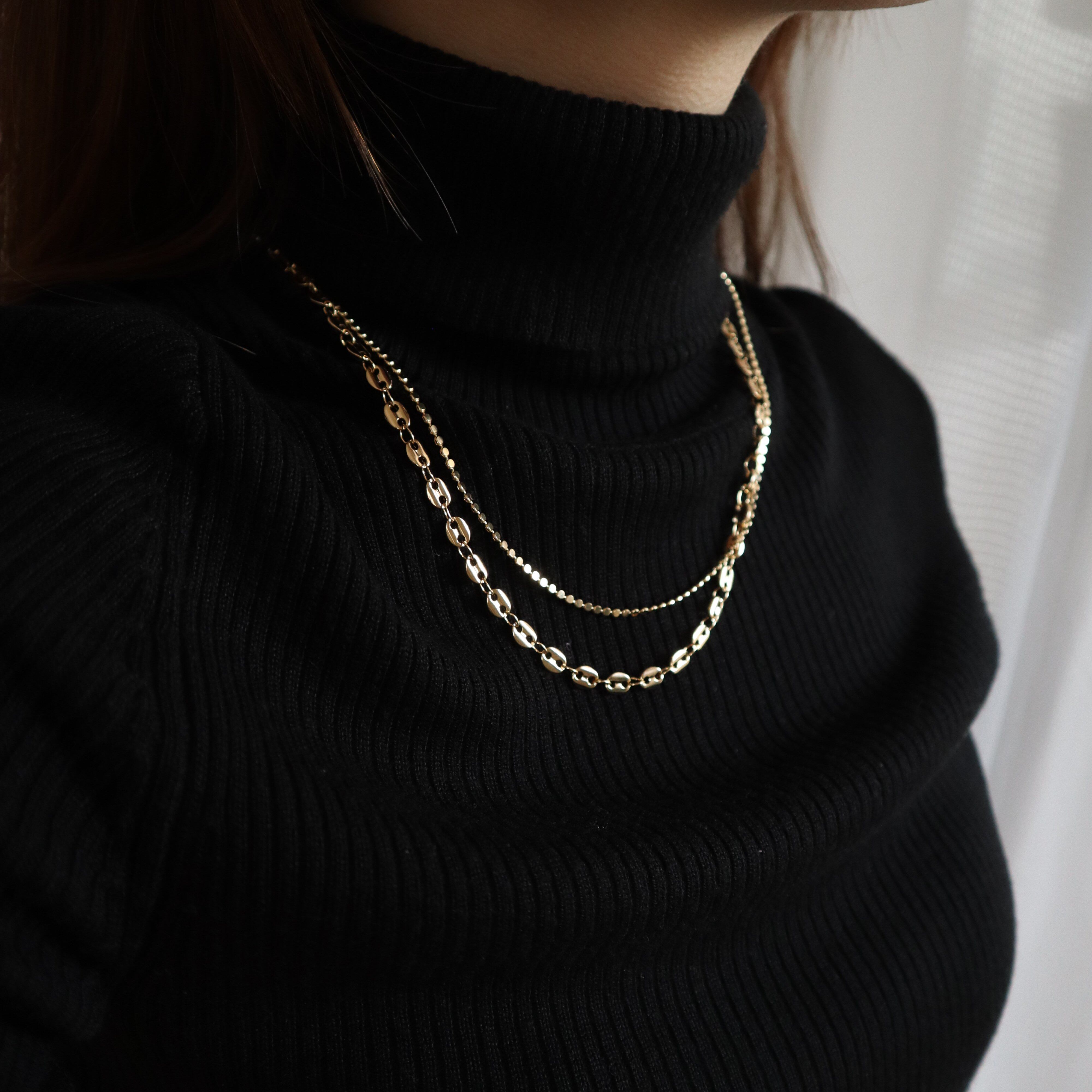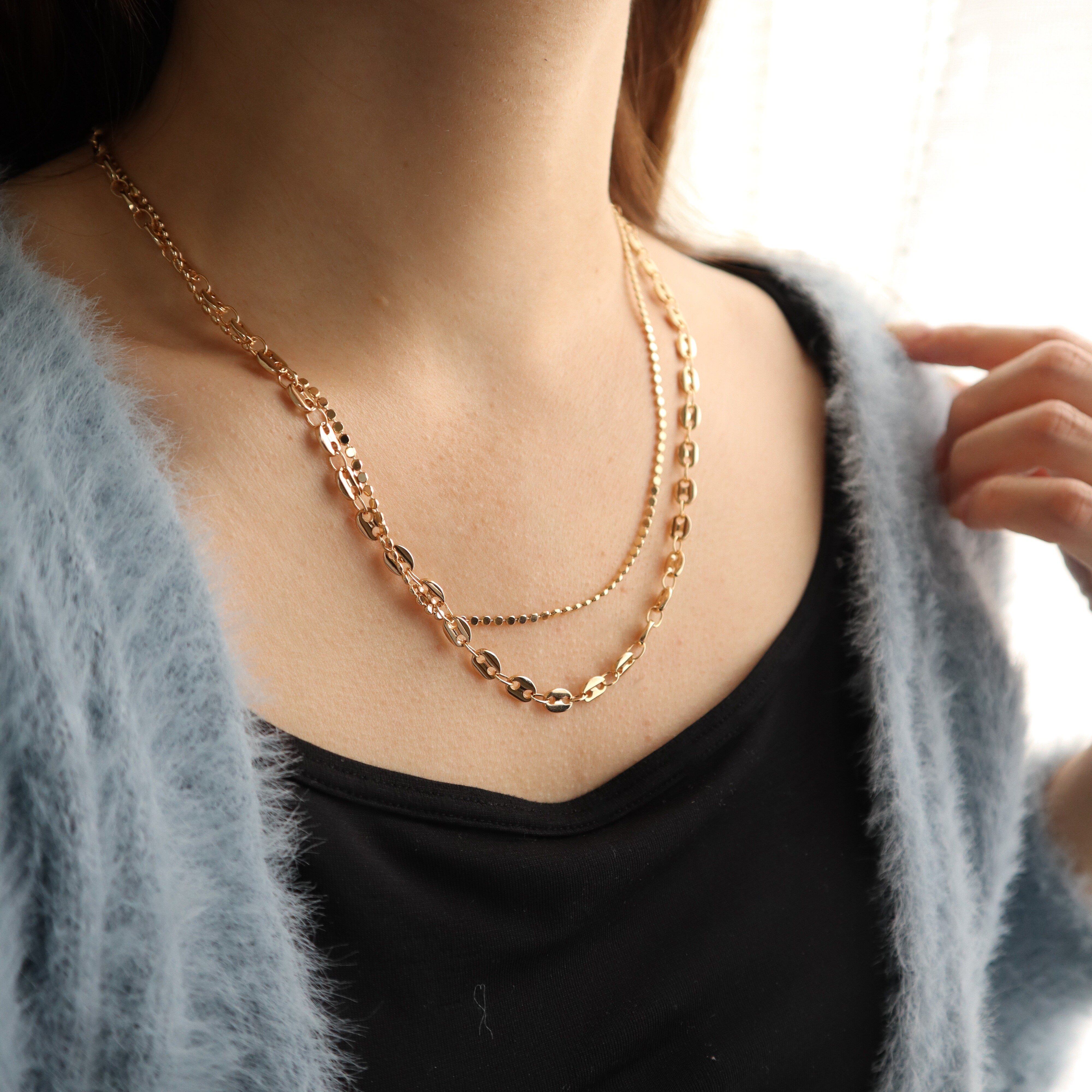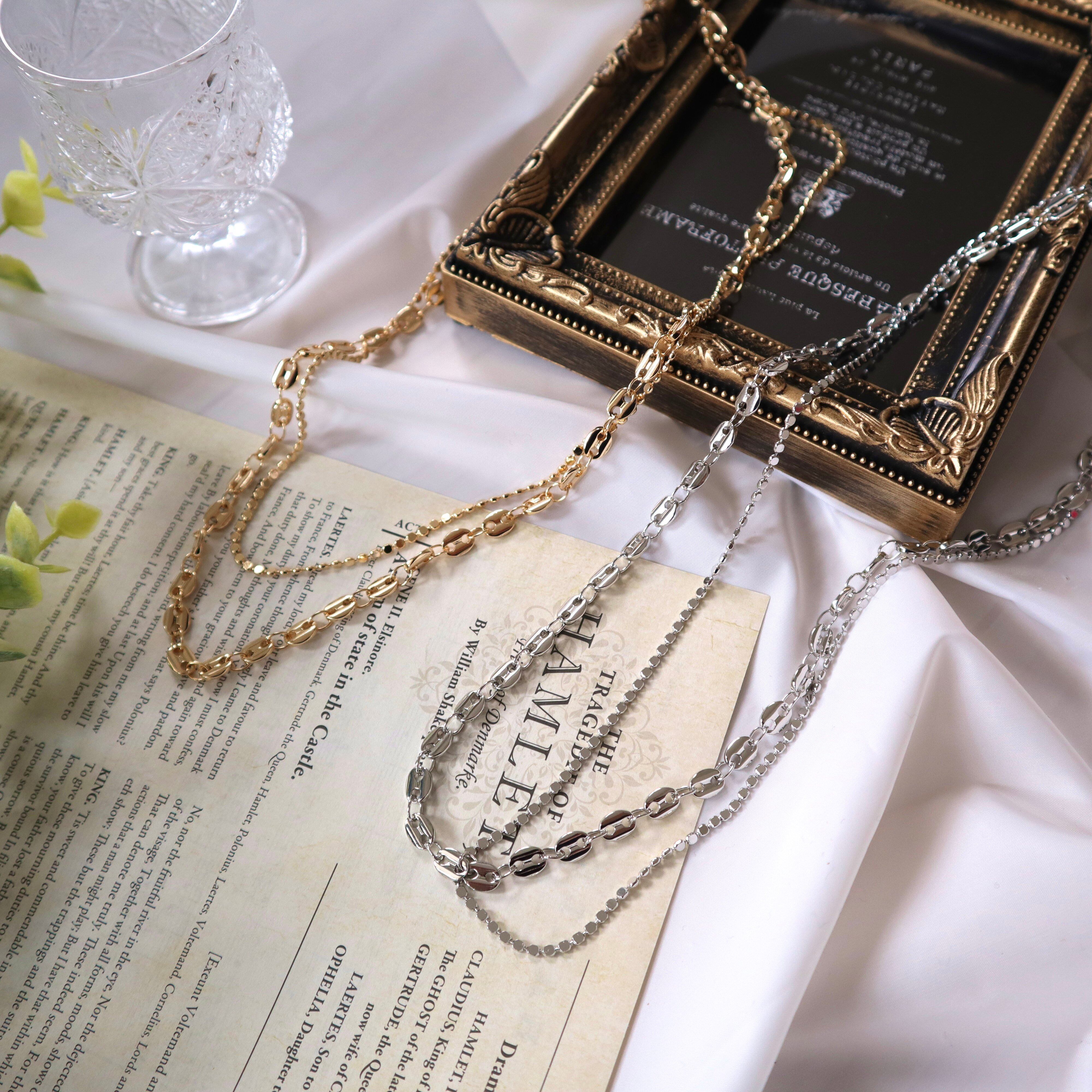2種類の個性的なチェーンを組み合わせたミドルネックレス。