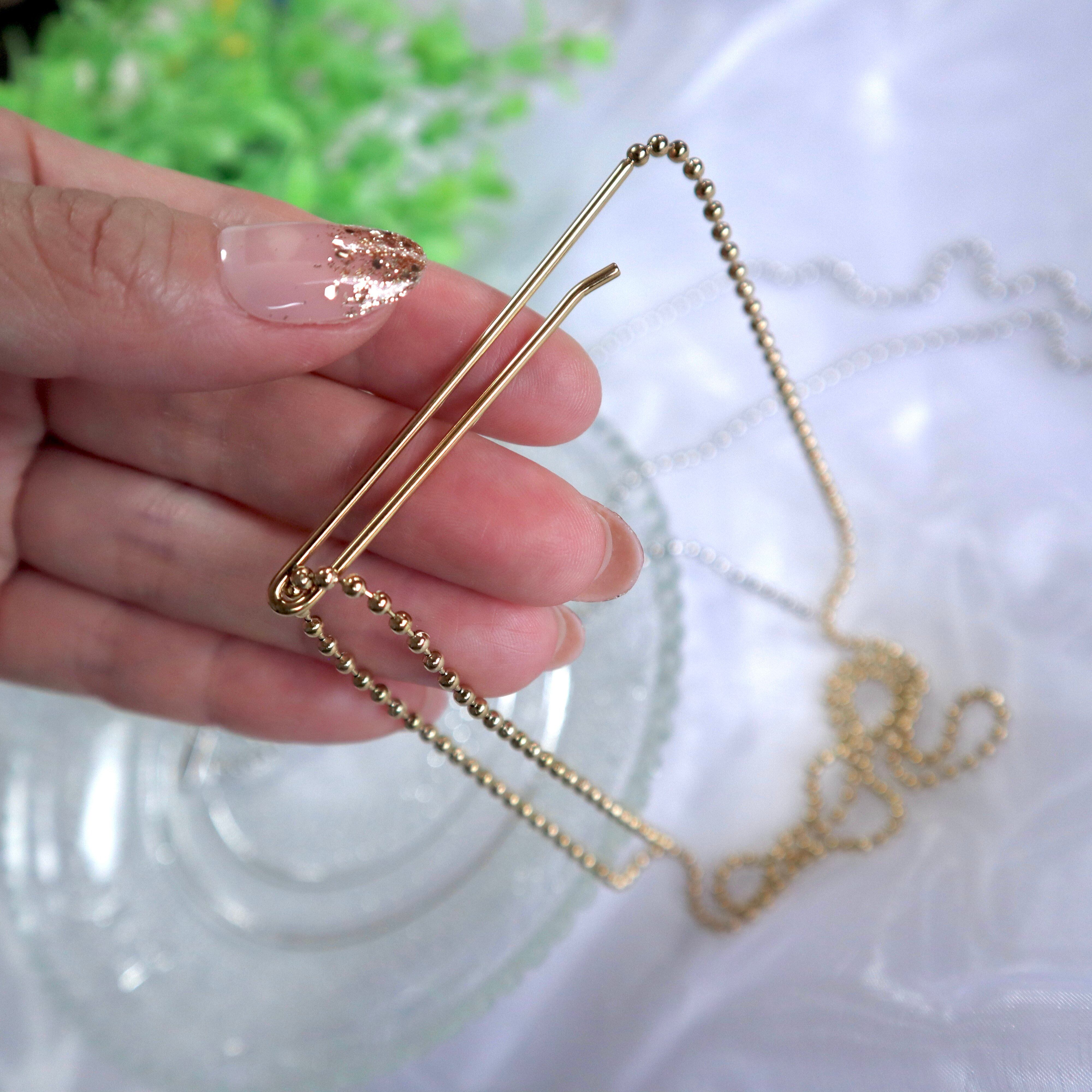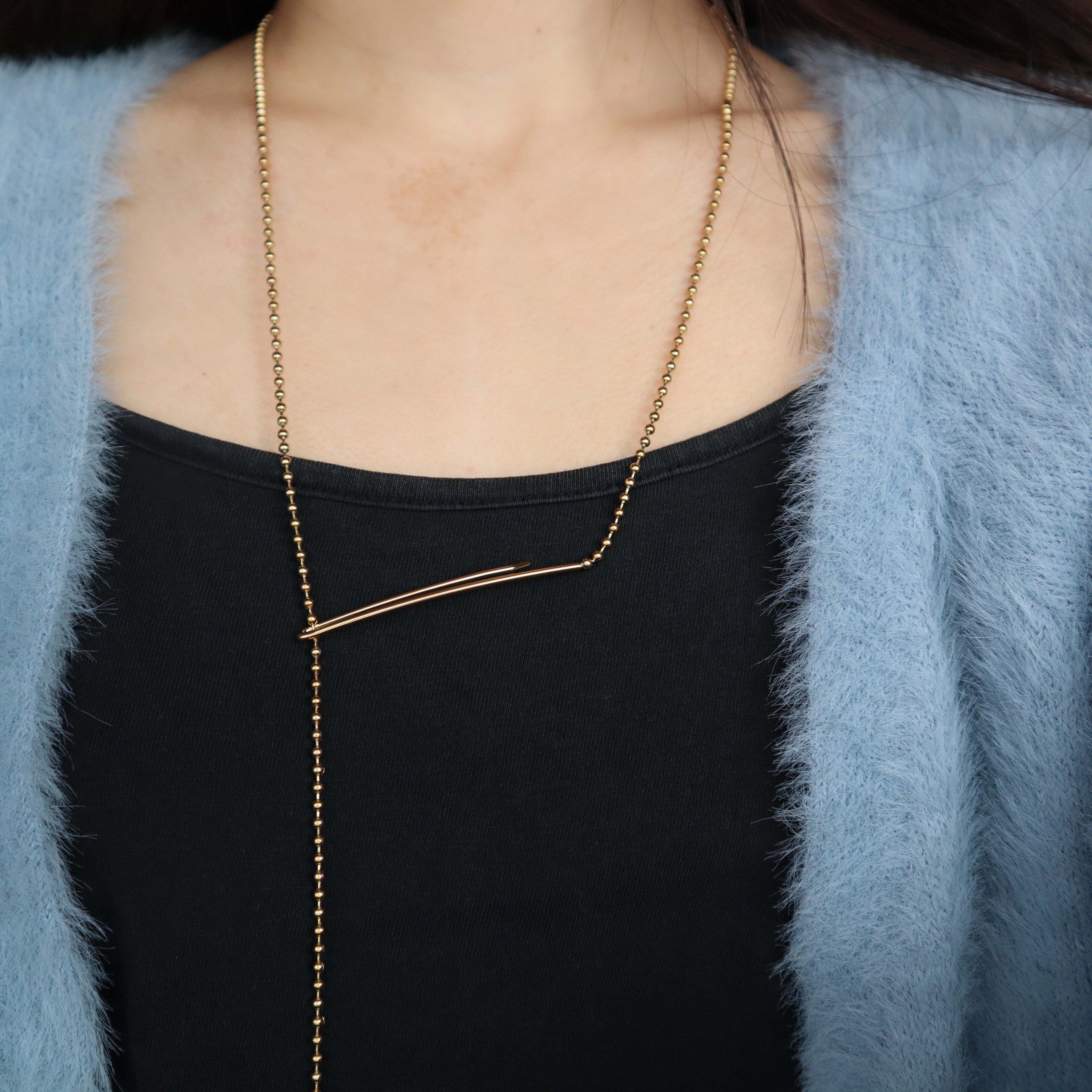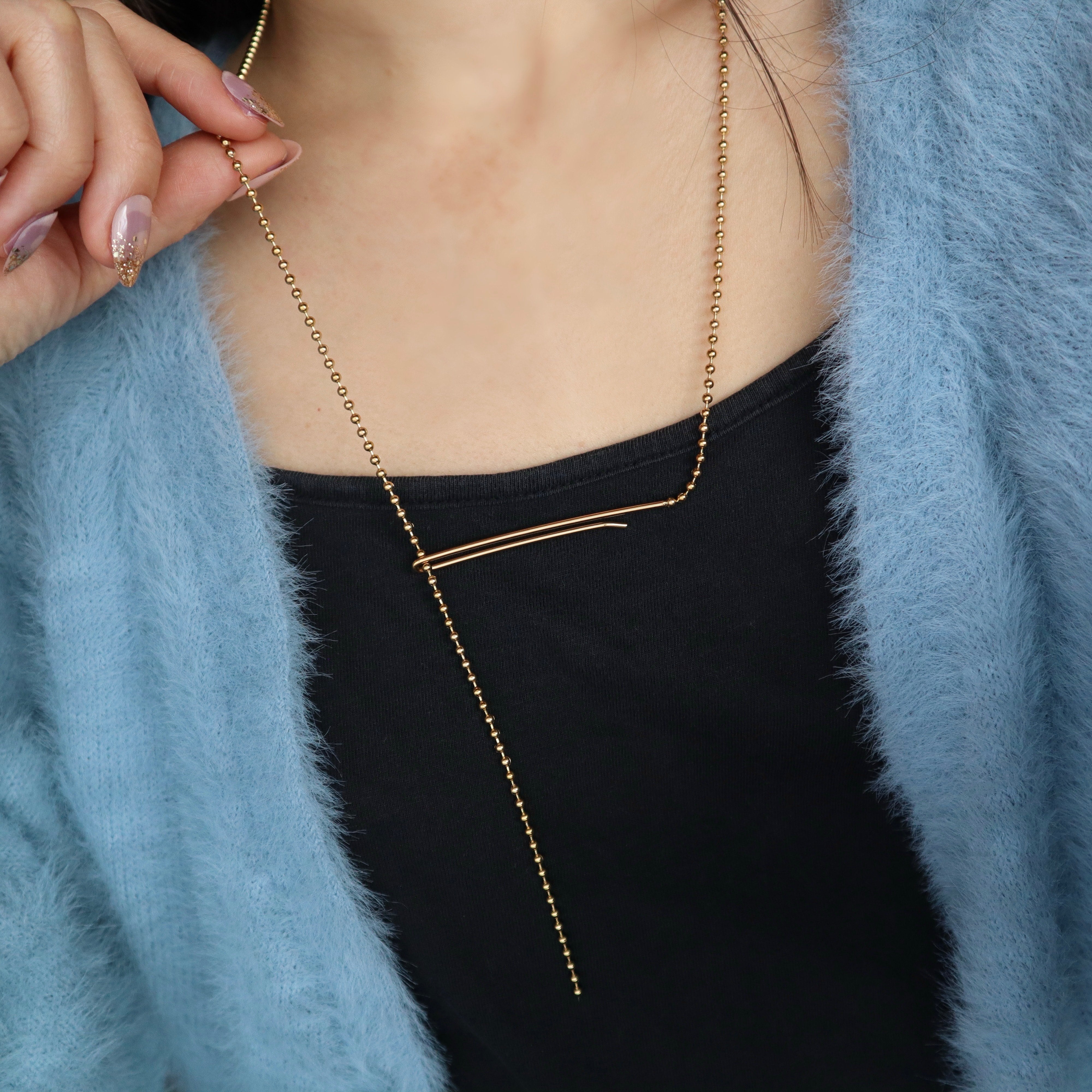 シャープな印象を与えるボールチェーンのラリエット。