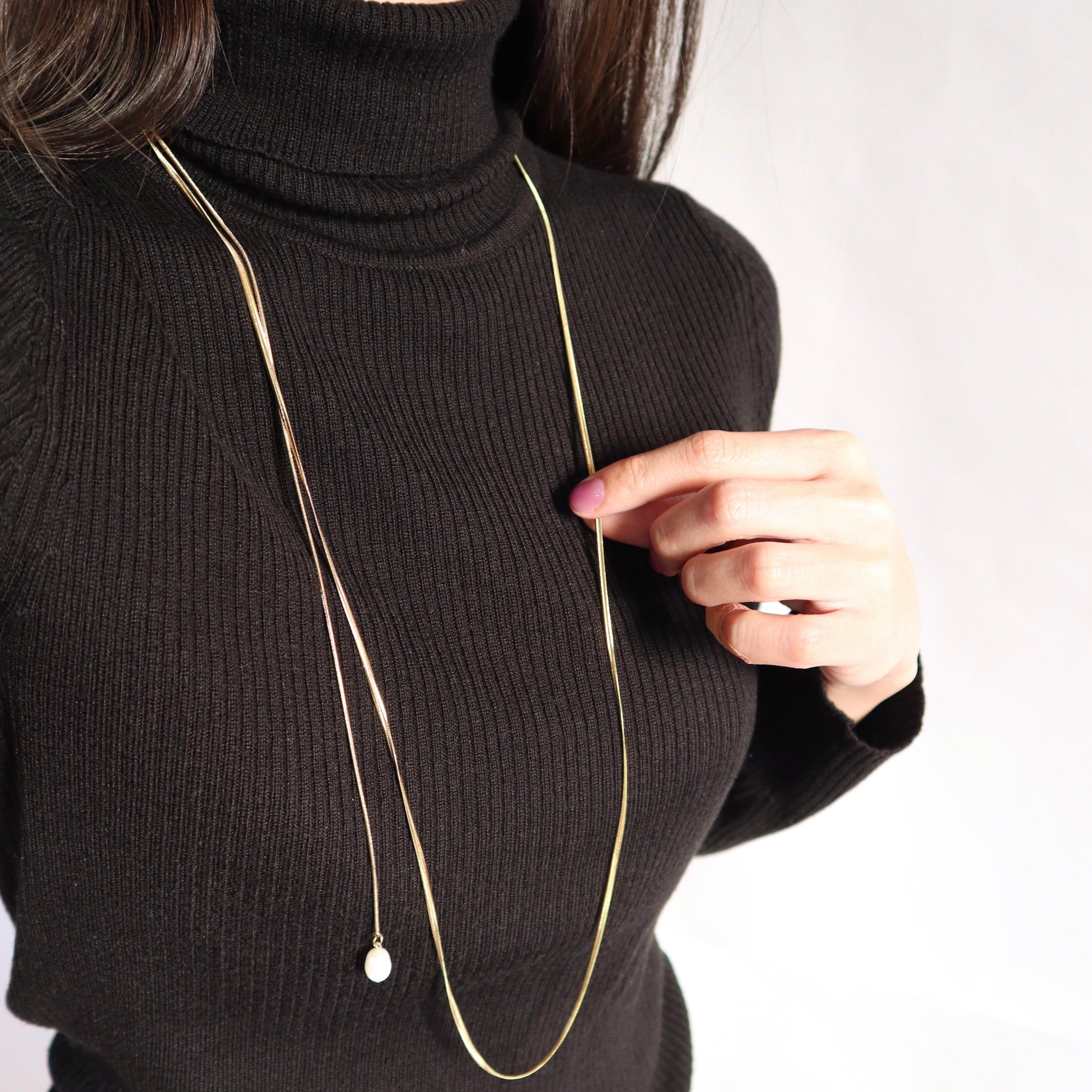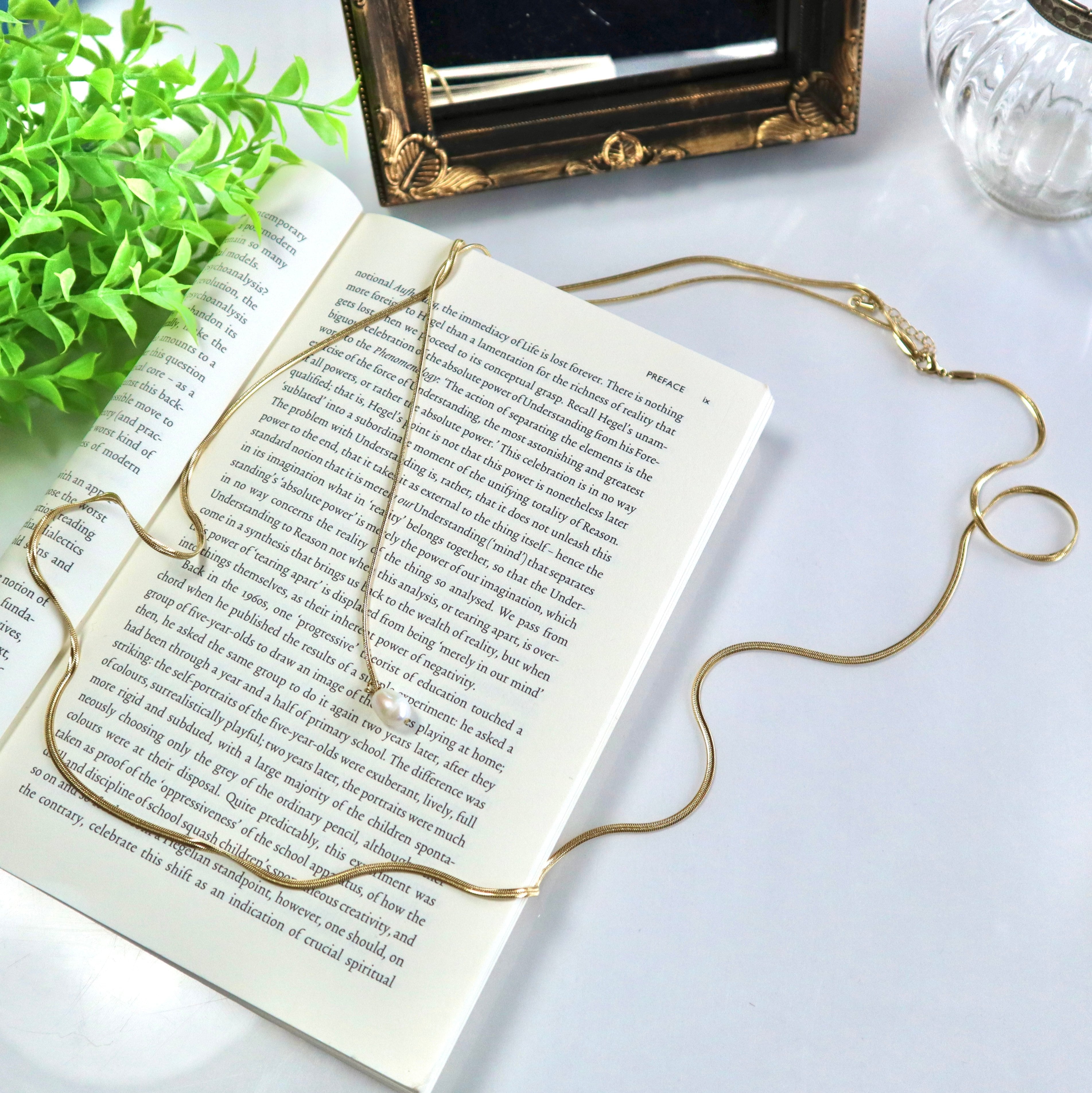 淡水パールが揺れるデザインのスネークチェーンロングネックレス。