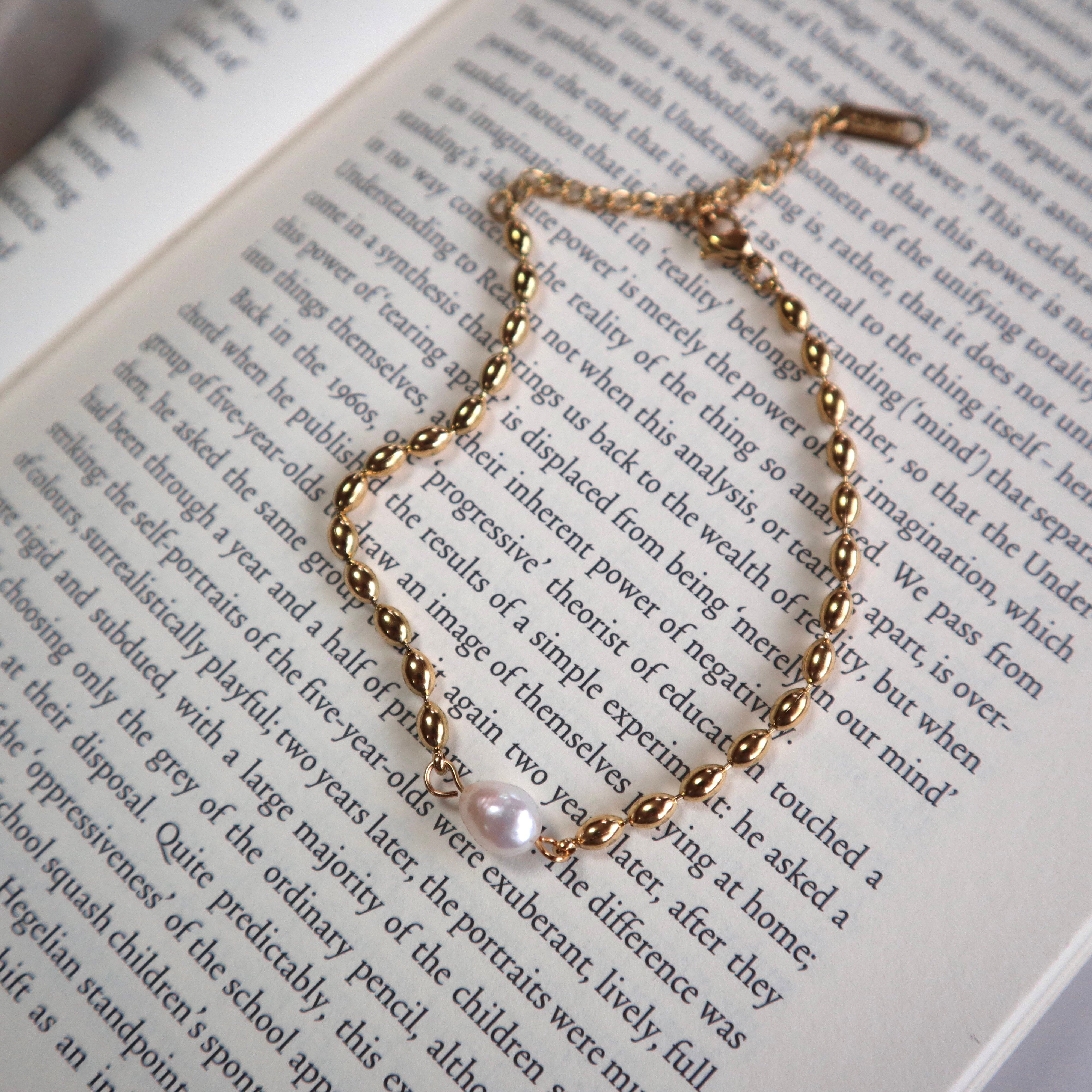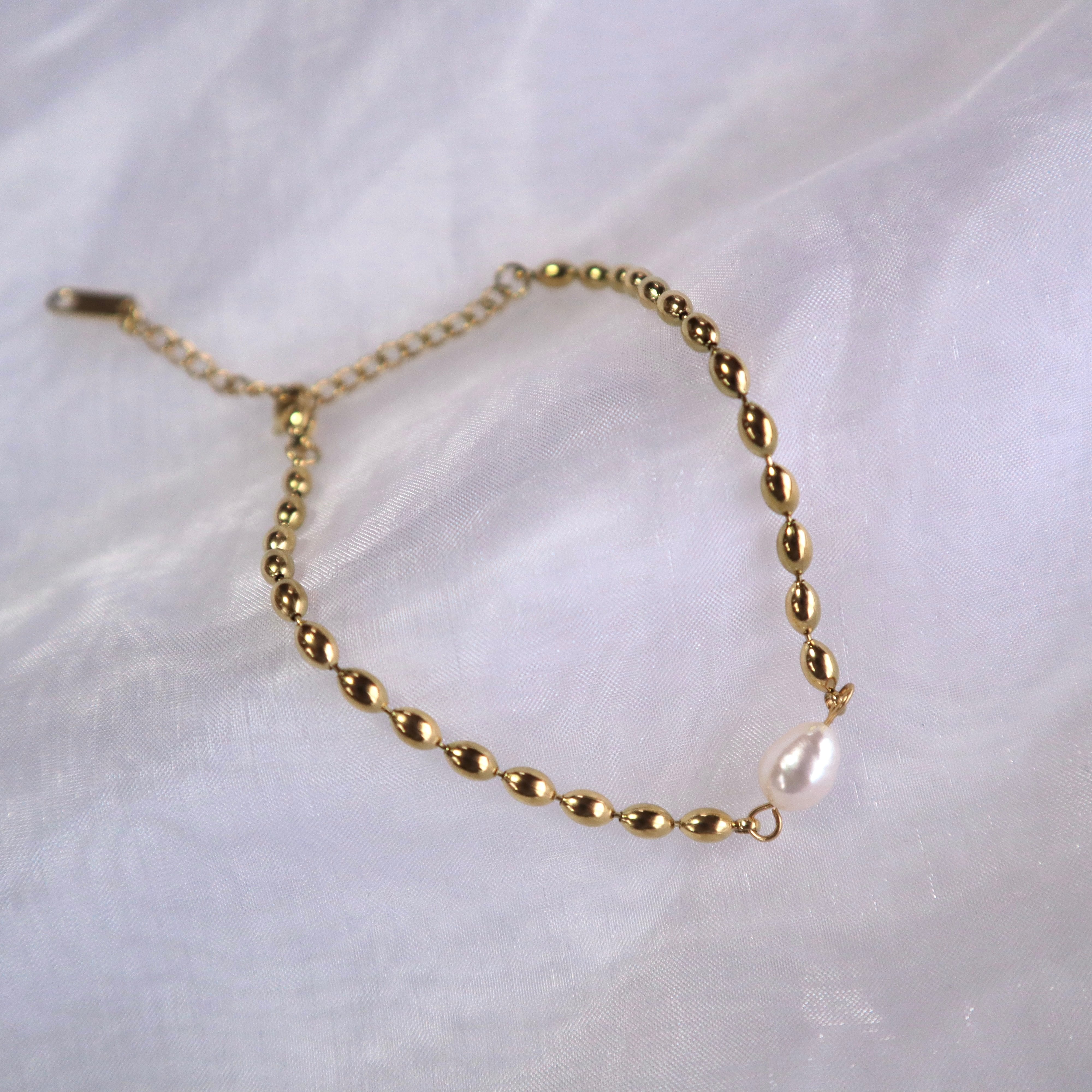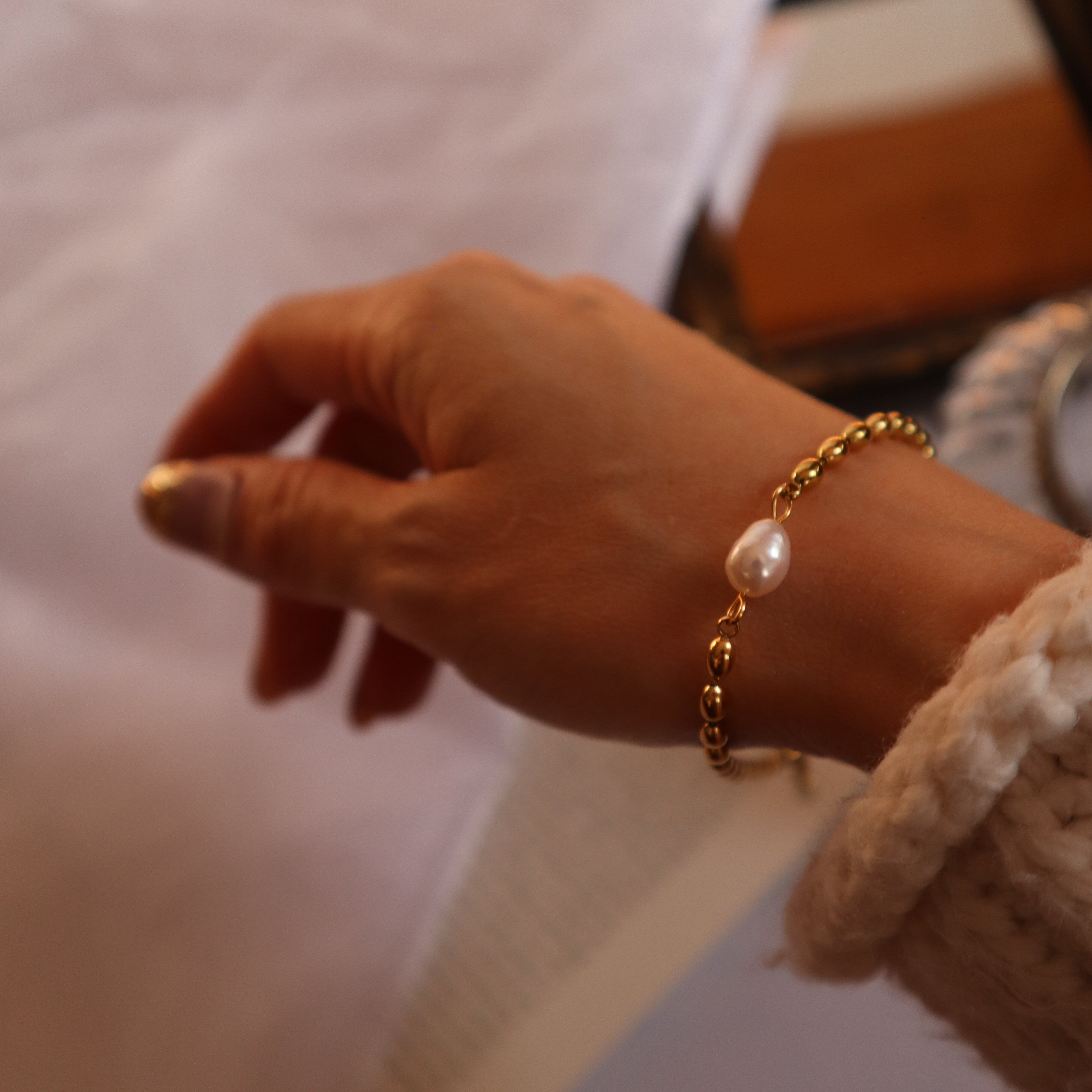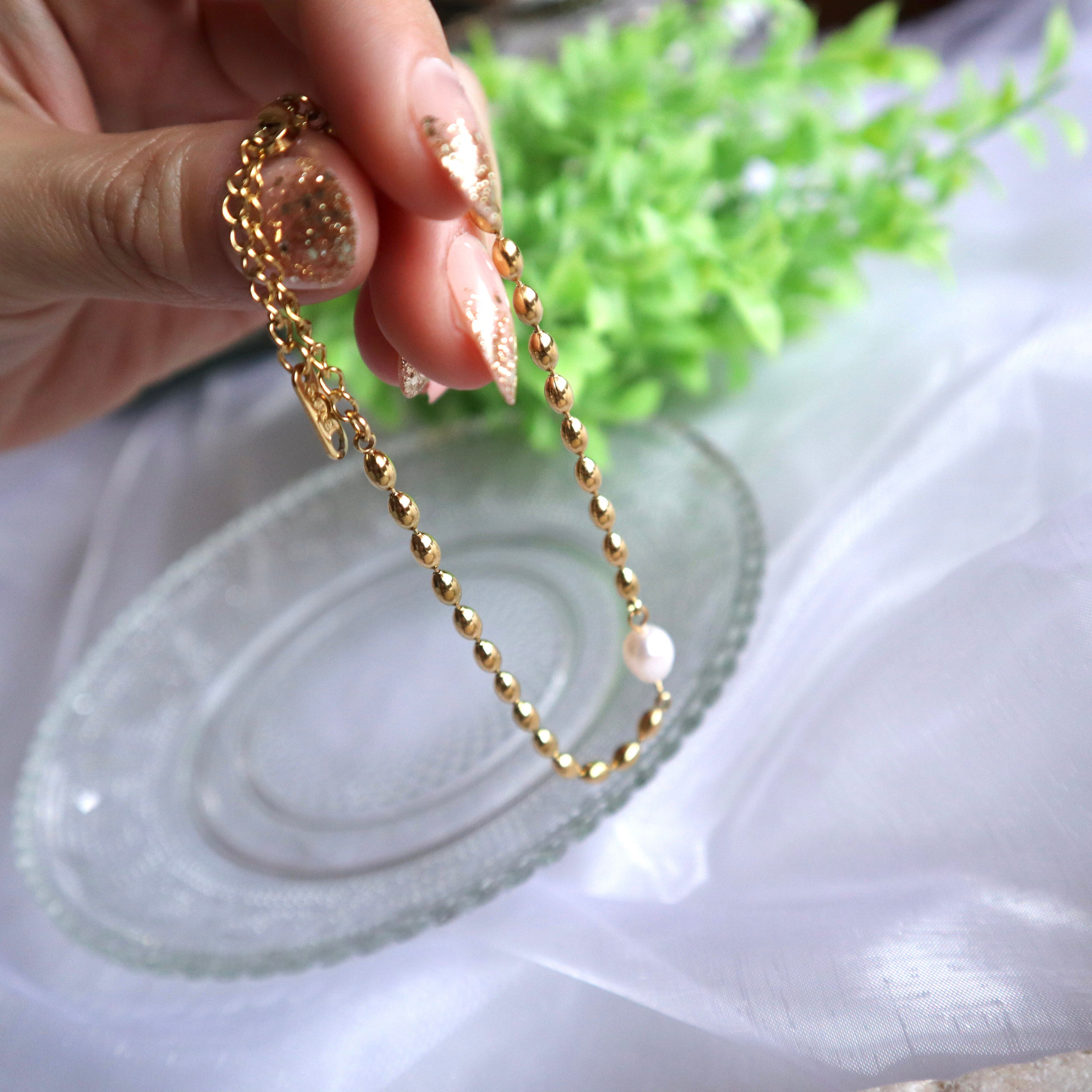 モードな印象のボールチェーンと淡水パールを組み合わせカジュアルダウンさせた甘×辛なネックレス。