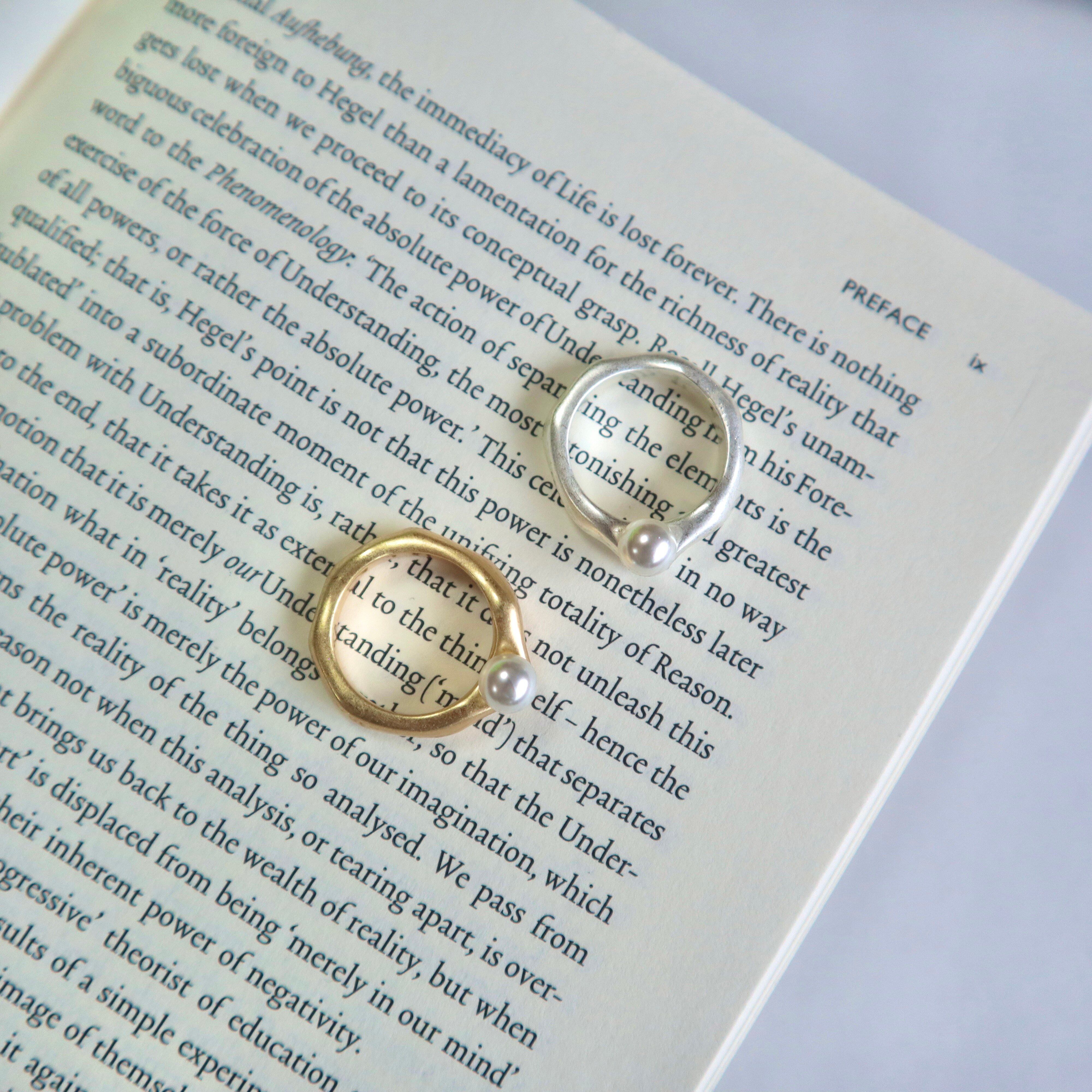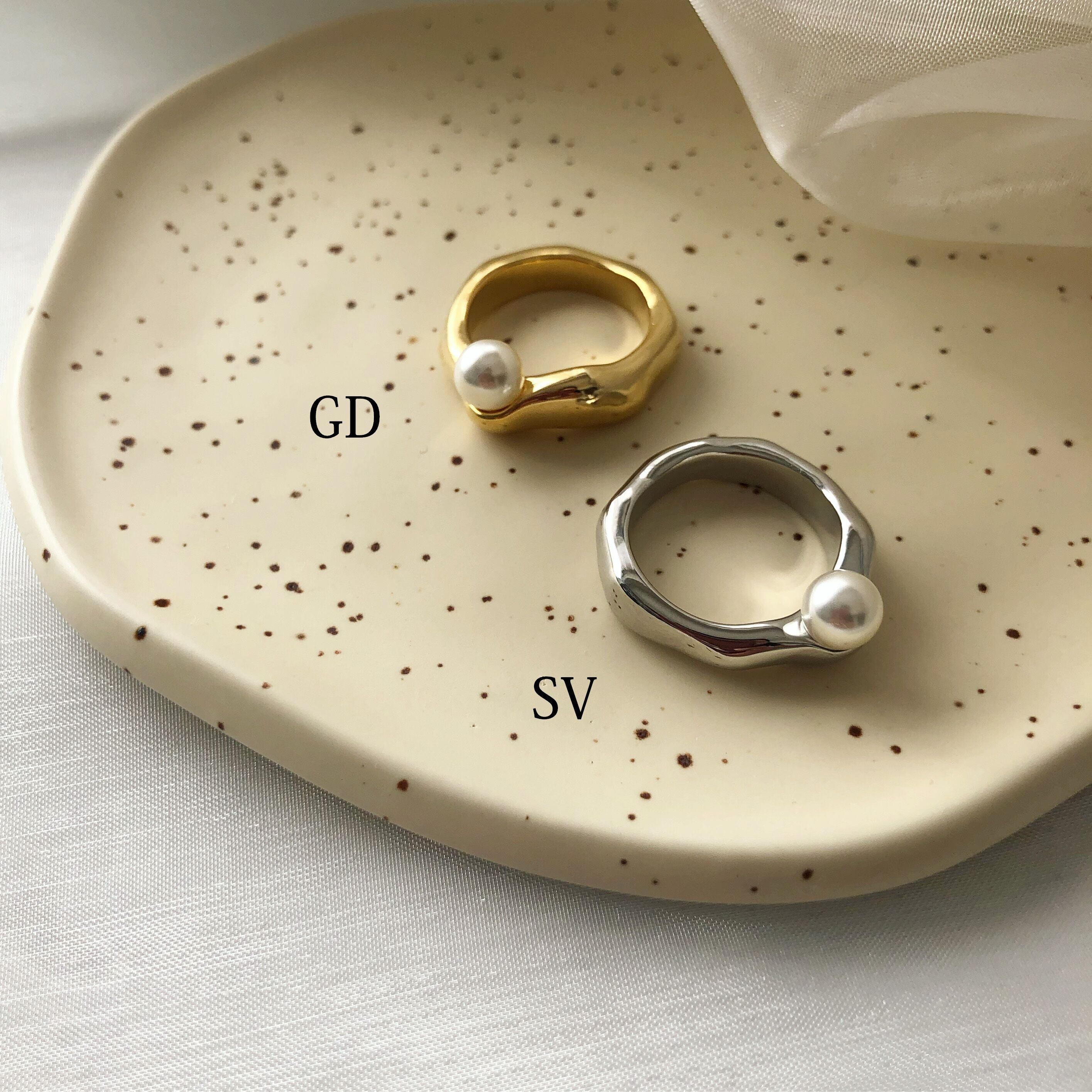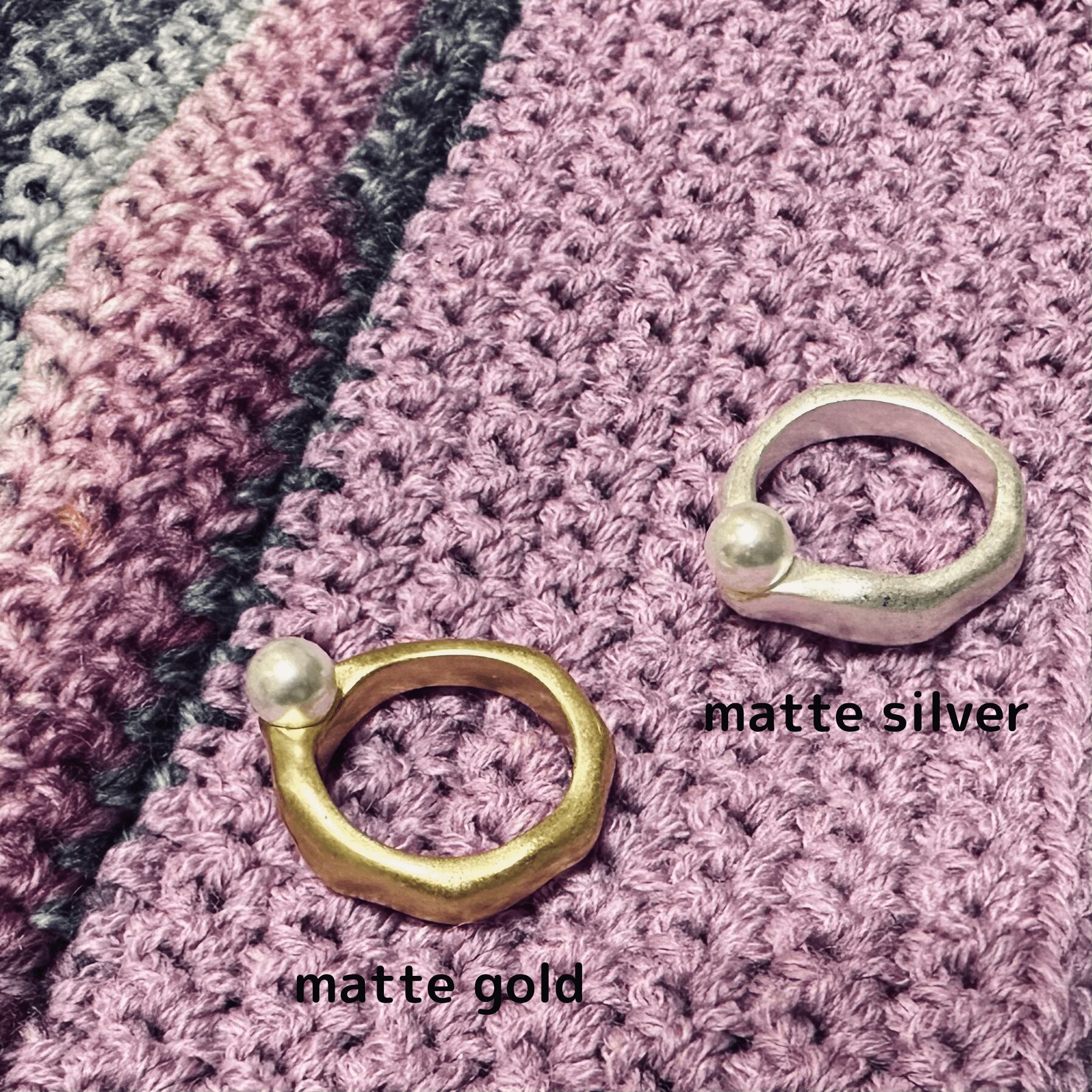 メタルの上にちょこんと乗ったパールが可愛らしいリング。
