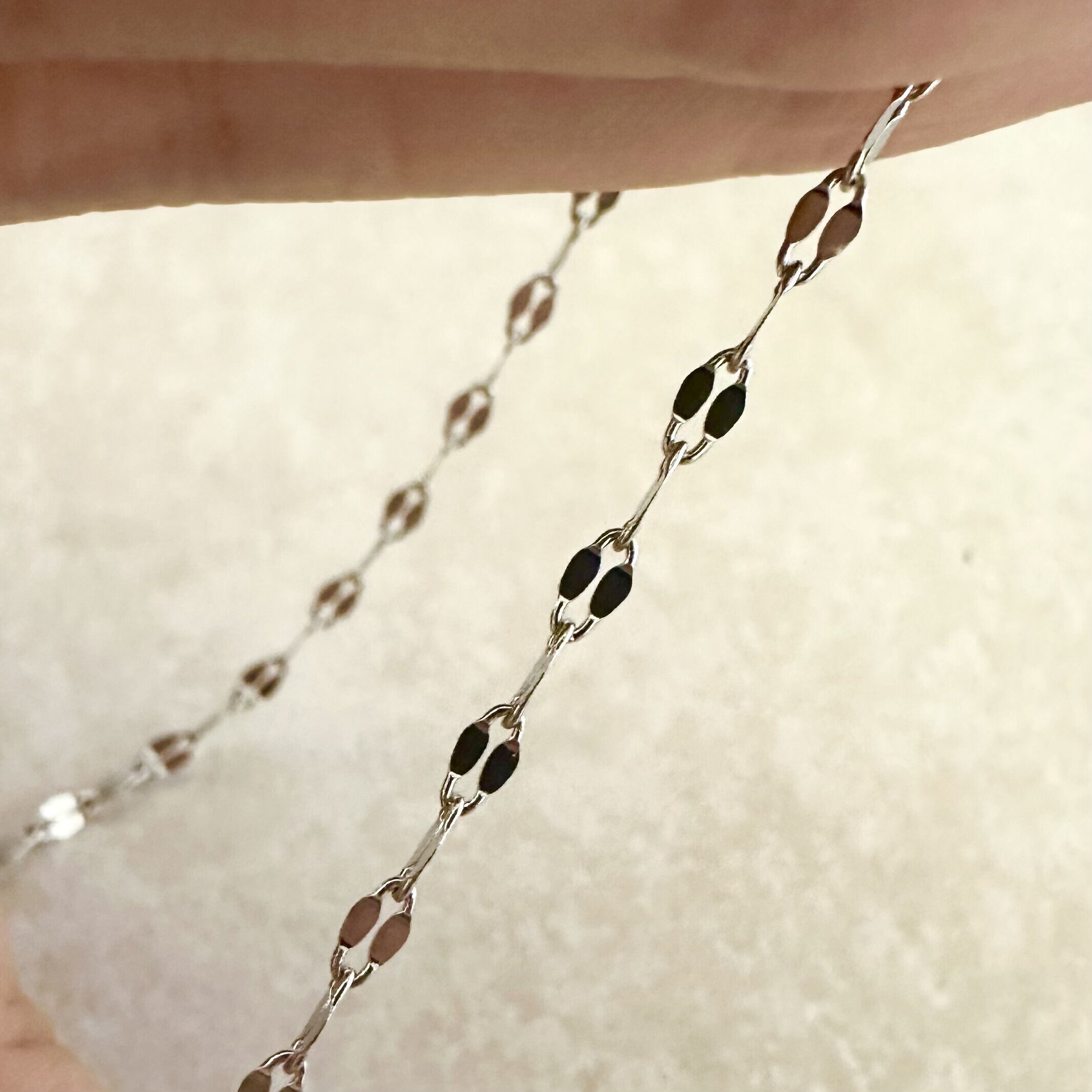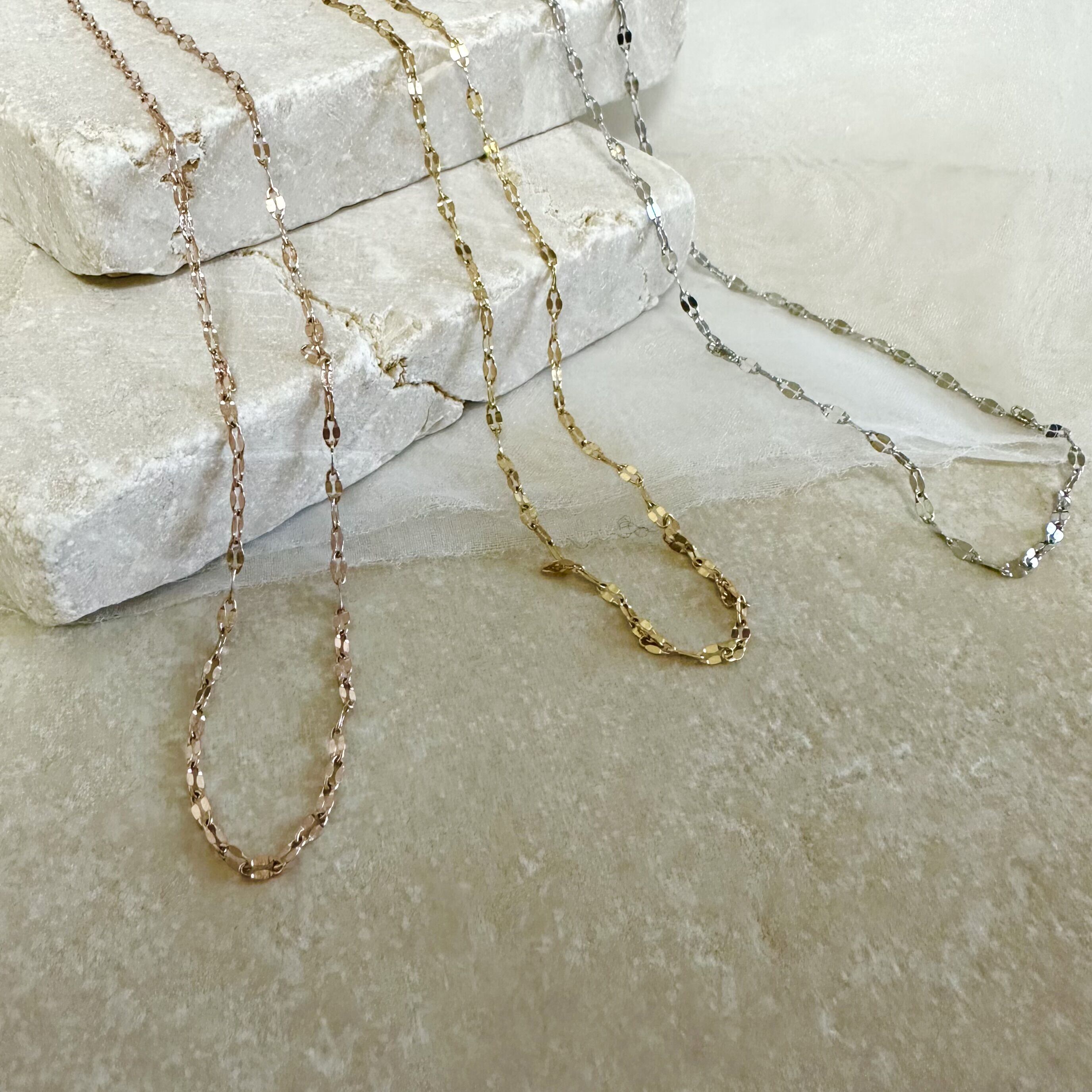 チェーンの部分に面があることで、光を反射してキラキラと輝きを放つのが特徴です。